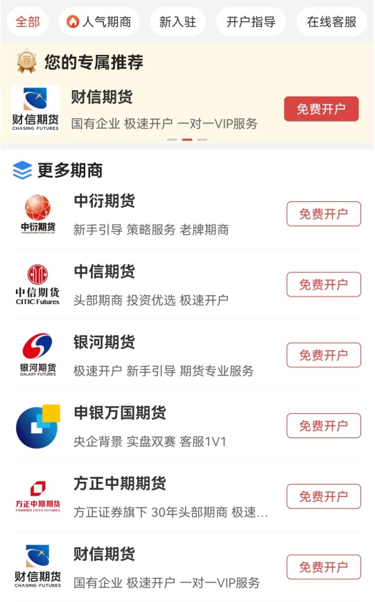 安装成功后,打开汇通财经APP,点击底部“开户”,选择平台商完成期货开户。